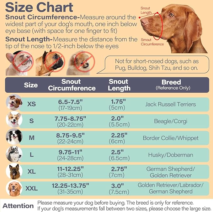 - Size M (Cir: 8.75-9.5”, length: 2.25–3”) – This dog muzzle medium sized dogs fits Border Collie, Beagle, Corgi, etc., but not for aggressive dogs, highly anxious dogs, and flat-faced dogs like Bulldogs. Measure your dog's snout circumference and length per the size chart or video. Ensure the muzzle fits comfortably, with the nose not touching the edge