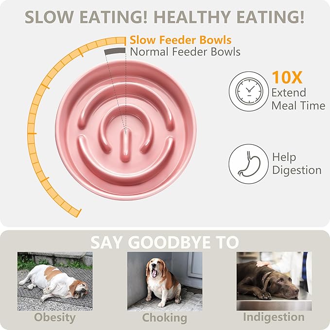 - 【Slow Eater Bowl】Change your dog's fast and excessive eating behavior — Pets that eat quickly tend to get fat and choke, which can make the dog sick. Our innovative slow feeder dog bowl is meticulously crafted to encourage your dog to eat at a slower pace, extending mealtime by 10 times.