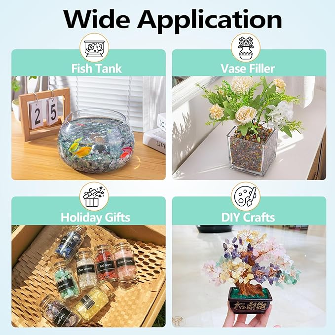 - Wide Application: Colorful crystal chips are not only suitable for home decoration, but can also be given as a birthday or Christmas gift to family and friends. Perfect for decorating aquariums, succulent plants, vases and DIY handcraft projects