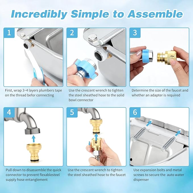 - Thickness 304 Stainless Steel: This automatic dog waterer are constructed of food-grade heavy gauge stainless steel, witch is sturdy as a rock to stands up to the wind and sun; The pet water dispenser won't like some plastic versions break down in the sun or crack in the winter cold; And included durable braided hose is also 304 stainless that standing up to the curiosity of animals prone to chewing