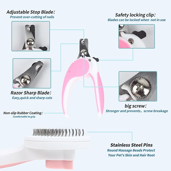 2PCS Pet Grooming Kit, Cat Brushes & Cat Nail Clipper, Cat Grooming Brush for Sedding and Grooming Fur (Pink)