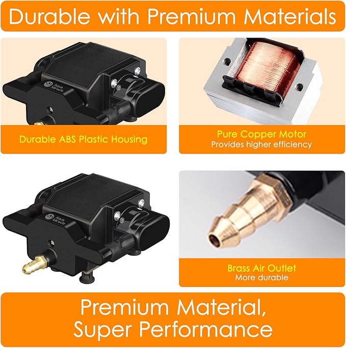 - QUIET OPERATION - Designed to be compact and silent, this fish tank air pump boasts a durable ABS plastic housing, advanced rubber diaphragm, and rubber vibration-relieve feet. The perfect sealing and multiple denoising structural considerations ensure a noise-free experience.