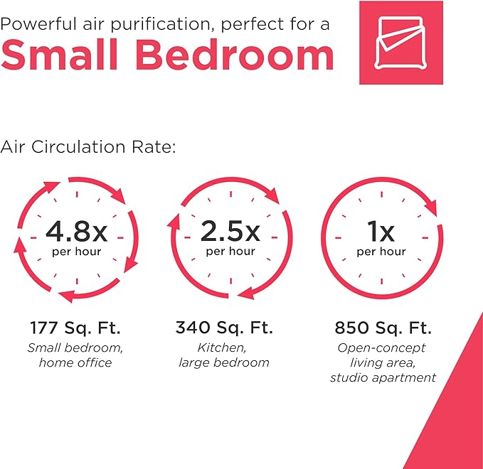 - Continuous Air Circulation: This air purifier filters the air 4.8x per hour in rooms up to 177 sq. ft. or 1x per hour in rooms up to 850 sq. ft., ensuring consistent air quality and freshness*