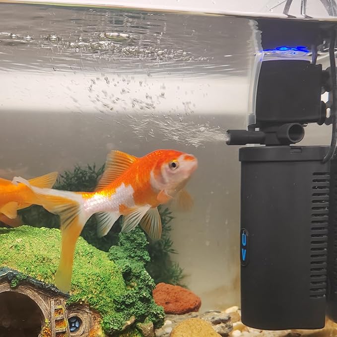 - 【ADJUSTABLE BUBBLES & OUTLET DIRECTION-Gentle for Fish】- Adjustable airflow and water outlet direction is gentle to fish, can meet different air supply needs; IPX8 waterpr00f: U-V light housing will not leakage. You can lay down the filter in low water level tanks