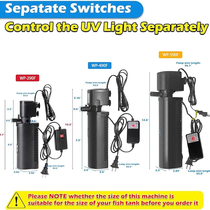 - 【EASY TO USE】- Applicable for marine and freshwater tanks, vertical or horizontal use. The lowest water level was 3.5 in. The pump, lamp and sponge can be easily disassembled and assembled. Simple maintenance, housing indicator showing U-V working status