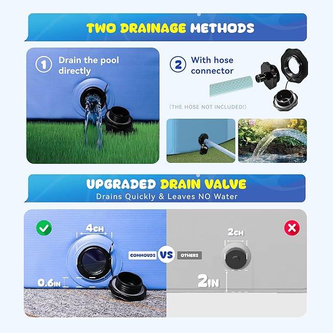 - Quick Drainage System: Our kiddie pool is designed for quick and efficient water release, featuring a drain valve just 0.2 inches from the bottom—lower than most pools—for faster drainage. The large 0.8-inch valve ensures minimal water residue. Additionally, we include a hose adapter so you can easily redirect the water and avoid backyard flooding