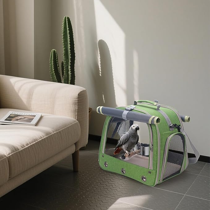 Bird Carrier Parrot Travel Cage with Perch, Food Bowl, Tray and Breathable Clear Window, Bird Travel Bag for African Gray Cockatiel Caique Conure Quaker, for Vetting Camping Hiking (Green)