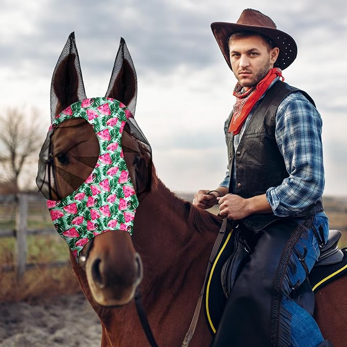 Frienda 4 Pieces Horse Fly Masks with Ears Face Covering UV Protection from Insect Pests Elasticity Smooth Comfortable Mesh Horse Mask Accessories(Fruit,Large)