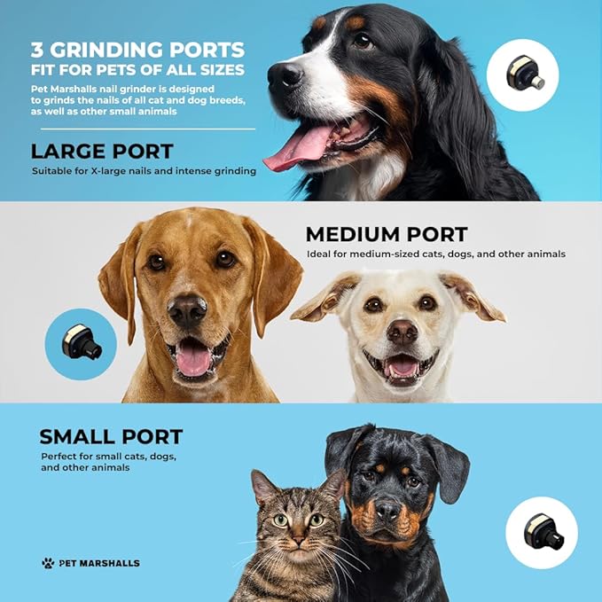 - Adjustable 3-Speed Motor & Multi-Port Design: Features 3 speed modes to handle every nail thicknessโfrom tiny kittens to large breed dogs. Includes multiple port sizes to safely grind claws, making it a gentle dog claw trimmer grinder for all ages, including senior or anxious pets.