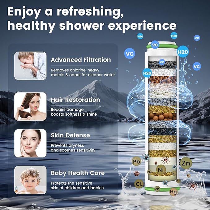 - Advanced Water Purification & Skin Protection: Experience healthier showers with our multi-layer filtration system featuring premium KDF and Maifan Stone VC balls. Effectively removes chlorine, heavy metals (lead, mercury, nickel, chromium), and impurities while retaining skin-friendly minerals. Ideal for sensitive skin care, this filtered shower head reduces dryness/itchiness, making it perfect for families with elderly, women, and children seeking chemical-free bathing.To avoid purchasing the incorrect replacement filter cartridge, please purchase the filter element link in the store: B0CPV542QG.