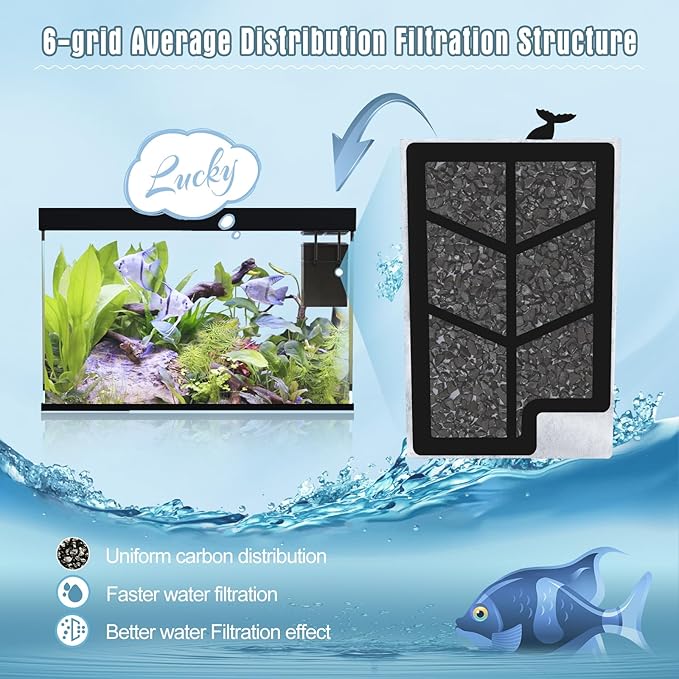 - Upgraded 6-grid Filtration Structure: We upgraded the structure of filter cartridges to use high density cotton + 50% more nutshell activated carbon + upgraded 6-grid design, which make the distribution of carbon more uniform without accumulation. Maximize water circulation efficiency and ensure the fish tank is always clean.