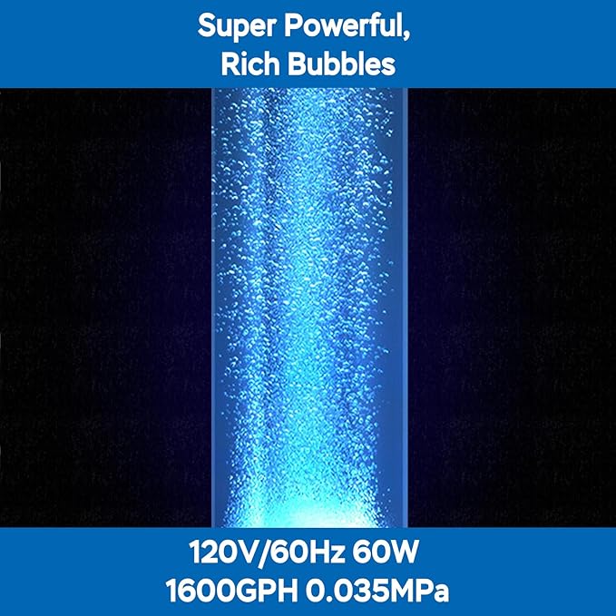 - PERFORMANCE - This pond aerator delivers oxygenation with its 60W full copper coil motor, producing a Max 1600GPH (100LPM) airflow at 0.035MPa pressure. The heavy-duty construction ensures maximum efficiency with minimal power consumption.