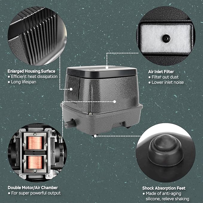 - IMPROVED HEAT DISSIPATION - The enlarged housing surface provides superior heat dissipation, keeping the pond air pump running stably. Perfect for continuous 24/7 operation in ponds, hydroponic air pump systems, or wastewater treatment.