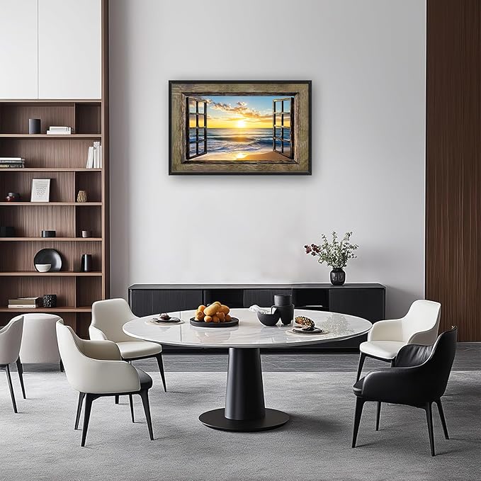 - 【Unique Design】A window frame with an ocean and sunset view, a beach scene with wooden frames, wall art for home decor, a beach landscape with open windows, photo-realistic, hyperrealism, high resolution.