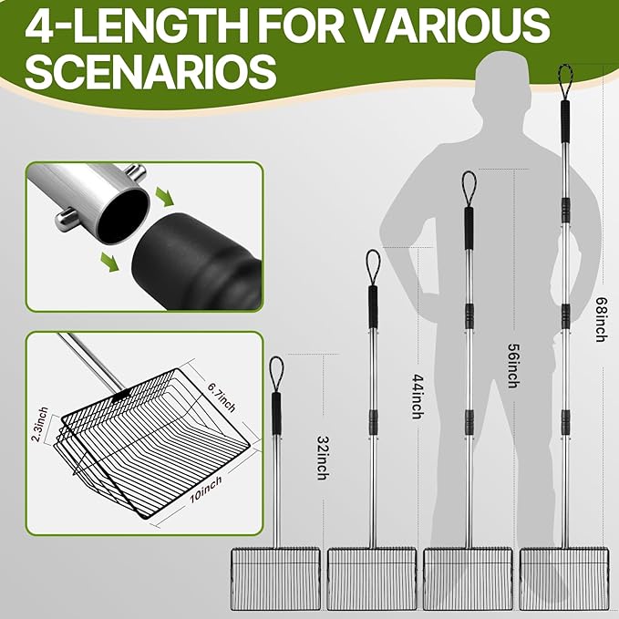 - 4-in-1 Adjustable Handle: Stainless steel telescoping handle adjusts to 24", 38", 53" or 68" with press-type buckle. Ideal for all heights when using a chicken coop scoop, cleaning horse manure, dog waste, sandboxes, or shoveling hay/straw. Perfect for chicken poop scooper attachments.