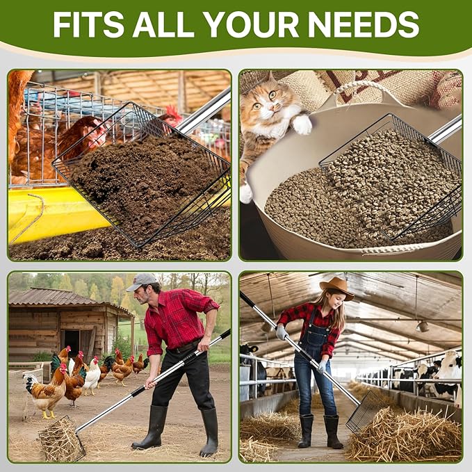 - Multi-Purpose Sifting Shovel: Convertible tool functions as: chicken litter sifter, cat waste scooper, beach sand sifter, and barn shovel. Interchangeable lengths adapt to poultry farms, pet owners, and outdoor cleanup.