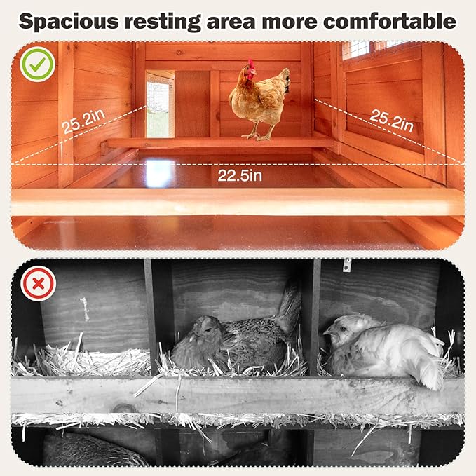 - 【Effortless Cleaning & Maintenance】Simplify coop upkeep with the removable pull-out tray for quick waste removal. The smooth-sliding doors and accessible design let you clean or check on your flock without hassle. Spend less time scrubbing and more time enjoying your chickens!