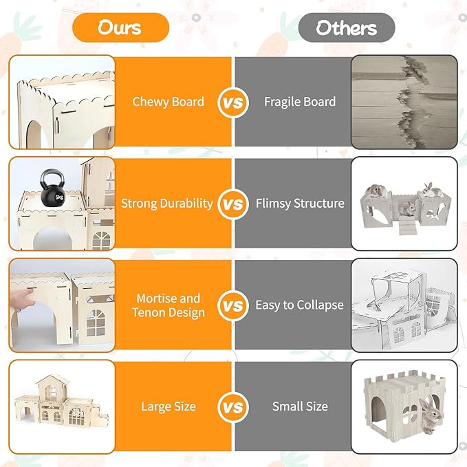 - Safe and Durable Bunny House: Crafted from 5mm-thick natural pine wood with smooth, splinter-free edges for your pet’s safety; This bunny castle’s sturdy construction ensures durability and stability, offering a secure space for medium-sized rabbits to explore and relax