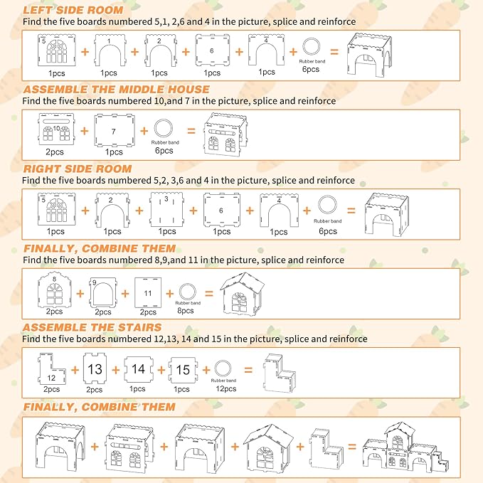 - Easy Assembly and Portable: Comes with 38 rubber bands and instructions for quick and easy installation. The modular design allows for disassembly, making it perfect for storage or travel as a portable rabbit huts or rabbit hideaway