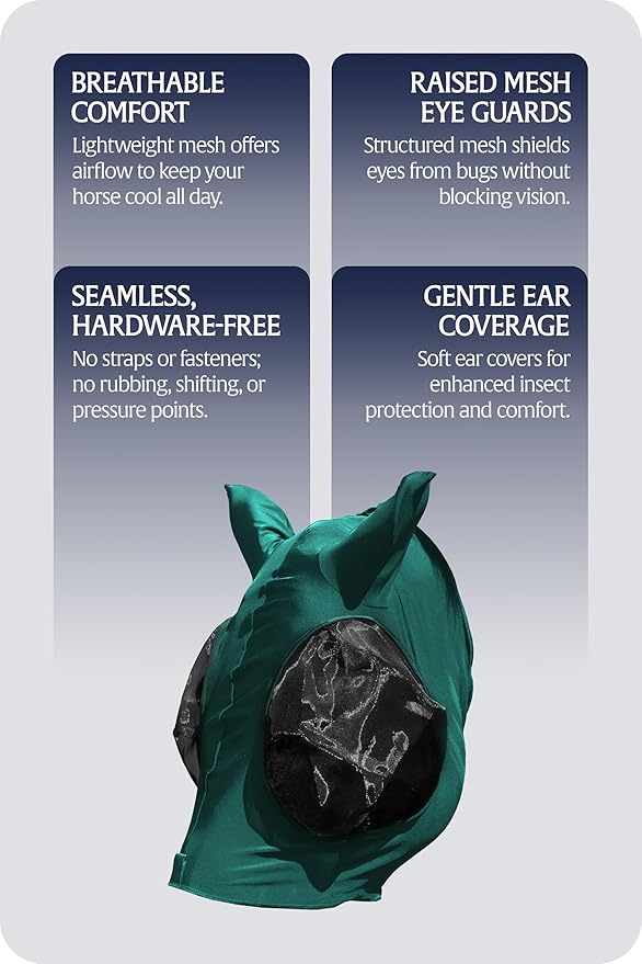 - ✅ Durable Raised Mesh Eye Protection – This fly mask features a durable raised see-through mesh screen over each eye, preventing flies from making contact with your horse’s sensitive eyes while allowing clear vision. Excellent protection with comfort.