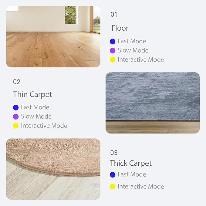 • Three Interaction Modes: Cat toys for indoor Cats has three modes, fast mode (Blue lights) rolls fast on high rug, slow mode (Purple lights) moves well on floor, Interactive mode (Yellow lights) only moves when nudged by your cats. Short press to switching working mode, and distinguish via the color of the light