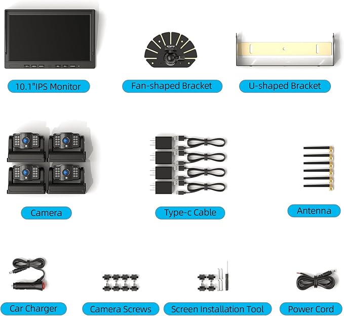 - 10.1" IPS Monitor & IR Night Vision:With high resolution of 1080 pixels, the larger monitor gives us broader and clearer image, the cameras offers a 150Β° wider view, so that we can drive with a pleasant mood