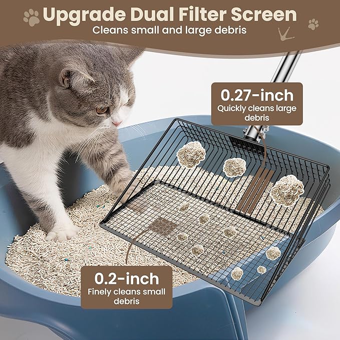 - Upgraded Chicken Coop Rake: The coop scoop has been upgraded with a 0.2-inch square mesh design. Suitable for separating smaller chicken manure, making the chicken coop cleaner and more comfortable. 0.27-inch rectangular sieve at the back end. Used for cleaning larger chicken manure to improve work efficiency