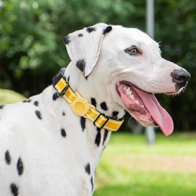 JSXD AirTag Dog Collar, Night Reflective Nylon Dog Collar for Small Medium Large Dogs,Lockable Quick Release Buckle,Padded Breathable Pet Collar with AirTag Holder (Yellow, Medium)