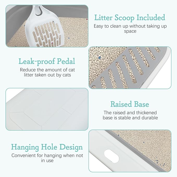 - Leakproof pedal design: The front of the shallow litter box has a removable hollowed-out leakproof pedal, which can effectively reduce the cat's paw crevice litter to the outside, keep the floor clean and tidy, give your cat a comfortable and clean living space