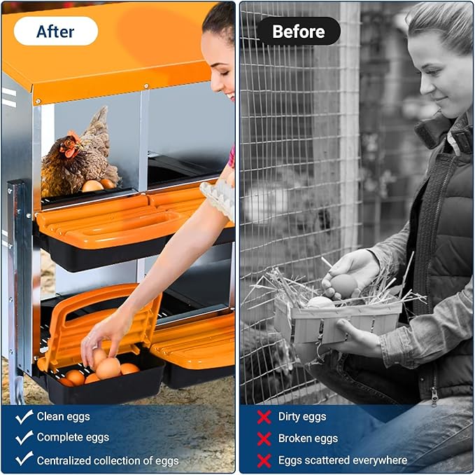- EFFICIENT EGG COLLECTION SYSTEM: Featuring a gentle incline, our innovative design allows eggs to roll into a conveniently accessible tray. This eliminates the need to reach into the nesting area, streamlining your egg collection routine and ensuring a clean, hassle-free harvesting experience.