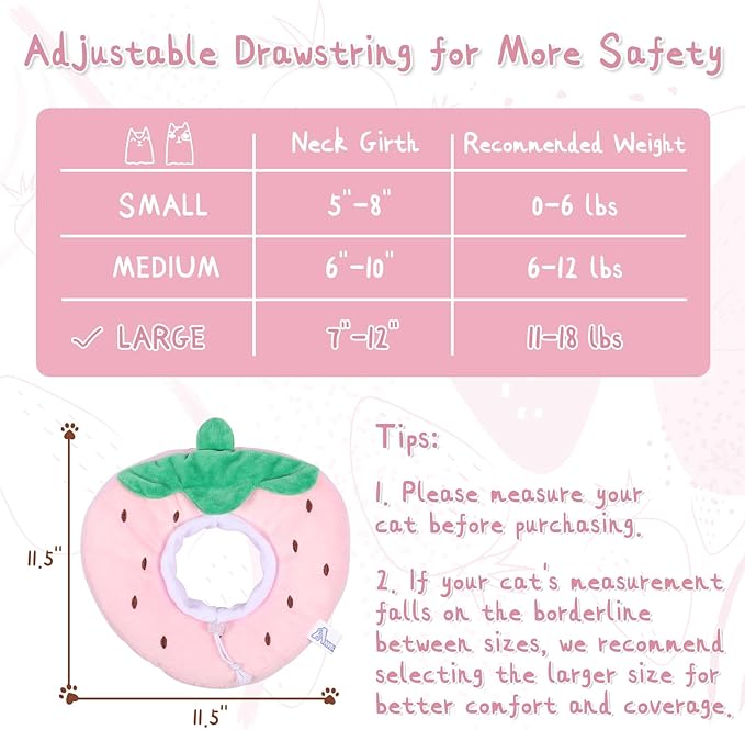 - 【SUITABLE FOR ALL SIZE OF CATS】 Soft cone for cats has an adjustable inner, so you can make a comfortable fit for your cat. By adjusting the stretchy string, cat won’t slip out of it that easily. Available in three sizes. Size L (11.5"×11.5") suitable for cats with a neck circumference of 7-12 inches (11-18 pounds cats recommended).