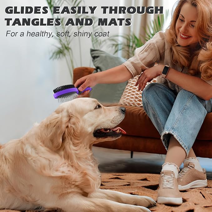 - 🐾【Double Sided Dog Hair Brush】The stainless steel pin brush removes pet hair effectively while the air-cushioned design massages the skin, promoting circulation without causing harm. The nylon brush side adds shine and health to the coat. Ergonomic handle for comfortable use.