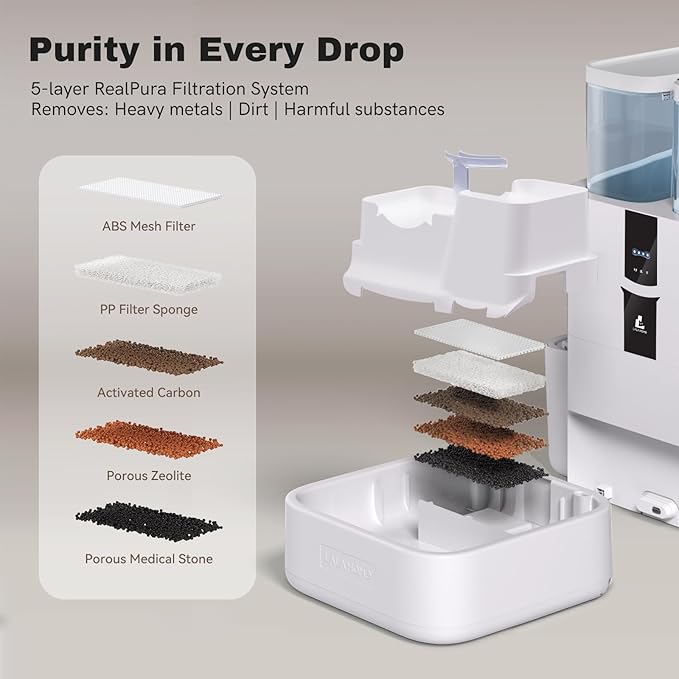 - Cleaner Water with the Unique 5-Stage Filtration: LALAHOME cat drinking fountain stands out with 5-stage filtration system: Water gets pre-filtered through a mesh screen, trapping hair and gunk in a sponge filter. Then it’s pushed through activated carbon, zeolite, and finally cleaned by the maifan stone. It can effectively filter and diminish the hair, impurity, odor, and chlorine. The filtered water dispenser can give cleaner water to pets and reduce the risk of developing illness.