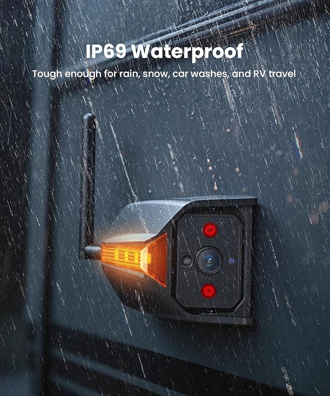- IP69K Waterproof: Built to withstand heavy rain, snow, and road spray from passing trucks. Whether crossing snowy mountain passes, driving along coastal highways, or rolling through muddy campgrounds, your RV reverse camera keeps working without fail