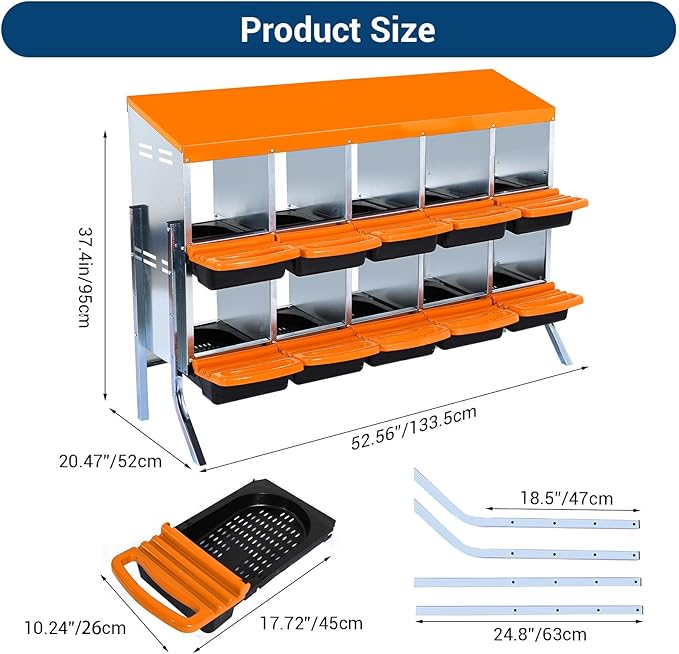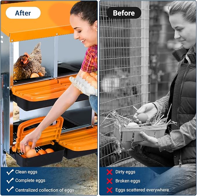 - CONVENIENT EGG COLLECTION MECHANISM: The unique tilting design of this nesting box allows the eggs to roll automatically into the collection tray for quick and easy egg collection. Say goodbye to tedious manual egg picking, you can easily access fresh eggs while ensuring they are intact.