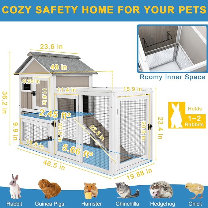 - 【SOLID WOOD BUILD FOR YEAR-ROUND INDOOR & OUTDOOR USE】Crafted from solid fir wood with a UV-resistant panel and asphalt roof, this rabbit hutch is weatherproof for all seasons. Measures 48"L x 23.6"W x 36.2"H—perfect for both indoor and outdoor setups.