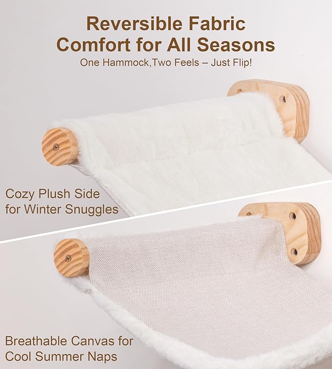 - Dual-Sided Fabric for Year-Round Comfort: Our wall-mounted cat hammock features a reversible design with breathable canvas for summer and soft plush for winter; Whether your cat likes to stay cool or cozy up, this hammock offers all-season comfort with one quick flip.