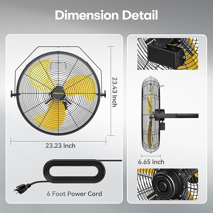 - 3 Speed Settings for Your Needs: Customize your cooling experience with low (4100 CFM), medium (4800 CFM), and high (5200 CFM)-speed options, catering to different needs and preferences—whether for normal circulation or intense airflow of the wall mount fan