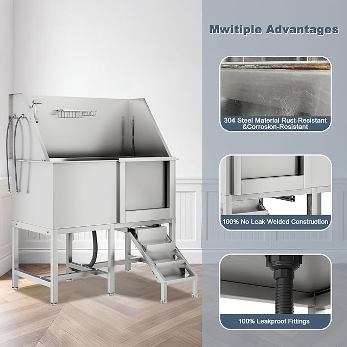 - 【Efficient Drainage and Leak-Free】:This dog wash station is equipped with a high-performance drainage system and integrated filter to prevent hair clogs. Our sewer hose connectors have screw-in threads and and the drain port is installed more securely. Stainless steel tub use seamless welding technology ensuring that the entire wash sink is leak-free and long-lasting use.