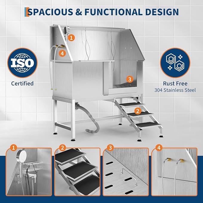 - Safety-Equipped Wash Tub Includes non-slip access ramp, storage cabinet, and locking gate mechanism to secure pets during bathing procedures.