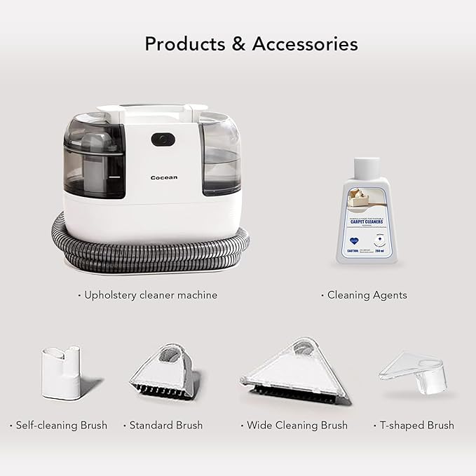 - 【NEW UPGRADE POWERFUL SUCTION】:The COCEAN Portable Carpet & Upholstery Spot Cleaner is equipped with a 500W motor, which can provide a super suction force of 18Kpa,and you can easily and quickly clean stubborn stains such as dirt, wine, pet feces, etc. on carpets and indoor decorations through spraying, brushing, and suction steps, ensuring that carpets dry quickly after cleaning and quickly return to normal, making your home environment healthier and safer.